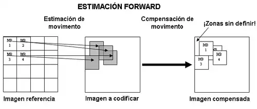 Hablaremos de estimación Forward sí definimos los MB en la imagen referencia. Calculamos los VM a partir de la imagen referencia. Para cada MB de la imagen referencia buscamos dónde ha ido a parar en la imagen actual (a codificar) y, a partir de la nueva posición, extraemos los VM. Puede que algunos MB, o píxeles, de la imagen referencia no aparezcan en la original y que por lo tanto identificamos una misma zona de la imagen a codificar como la más parecida a más de un MB de la imagen referencia (1). Por generar la imagen compensada cogeremos cada MB de la de referencia y lo colocaremos en la nueva posición que le corresponde según los VM que hemos calculado. Si nos encontramos con (1) algunos píxeles de la imagen compensada se sobrescribirán y otros quedarán sin definir generando “agujeros”. Este problema no pasa si aplicamos estimación Backward, que define los MB en la imagen a codificar y busca dónde se encontraban (o se encontrarán) en la de referencia. Calculamos los VM a partir imagen actual. De esta manera, para llenar cada MB de la imagen compensada iremos a buscar dónde se encontraba en la imagen de referencia y copiaremos todos los píxeles. Aquí lo único que hacemos es llenar MB según los VM que hemos encontrado y por lo tanto no habrá ningún píxel sin definir. Es por esta razón que los estándares de codificación de vídeo utilizan la estimación Backward en lugar de la Forward.