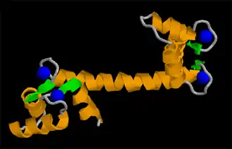 La estructura terciaria se realiza de manera que los aminoácidos apolares se sitúan hacia el interior y los polares hacia el exterior en medios acuosos. Esto provoca una estabilización por interacciones hidrofóbicas, de fuerzas de van der Waals y de puentes disulfuro[1] (covalentes, entre aminoácidos de cisteína convenientemente orientados) y mediante enlaces iónicos.