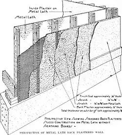 Después de humedecer a fondo la mampostería o el listón de madera, la primera capa de rayado debe aplicarse al sustrato de mampostería, o al listón de madera o metal, en un espesor que corresponda al original si existe, o generalmente alrededor de 1⁄4″ a 3⁄8. La capa de raspado debe rayarse o rayarse en cruz con un peine para proporcionar una clave para sostener la segunda capa. Por lo general, cada capa tarda entre 24 y 72 horas, y más si hace frío, en curarse antes de poder aplicar la siguiente. La segunda capa debe tener aproximadamente el mismo grosor que la primera, y el grosor total de las dos primeras capas no debe superar, por lo general, unos 5⁄8″. Esta segunda capa o de nivelación debe ser desbastada utilizando un flotador de madera con un clavo que sobresalga para proporcionar una clave para la capa final o de acabado. La capa de acabado, de aproximadamente 1⁄4″ de espesor, se aplica después de que la capa anterior haya fraguado inicialmente. Si esto no es factible, la capa base debe humedecerse a fondo cuando se aplique la capa de acabado posteriormente. La capa de acabado debe trabajarse para que coincida con la textura del estuco original.[5]