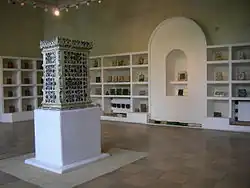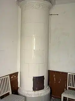 La estufa está hecha de cerámica como ladrillo (ladrillo refractario), baldosa, piedra, estuco o una combinación de materiales, en lugar de acero o hierro fundido. Normalmente requiere un soporte especial para soportar su peso. Consiste en una caja de fuego y canales de intercambio de calor o tabiques que proporcionan una superficie adicional. Estos absorben el calor de los gases de escape calientes antes de que los gases salgan a la chimenea . Cuando no se dispara, la conexión del calentador de cerámica a la chimenea a veces tiene un amortiguador para evitar que el calor se escape por la chimenea; entonces el calor se irradia desde la cerámica.
