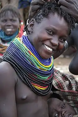 - Toposa. Unos 300.000 individuos, la mayoría en el estado de Kapoeta, en el sudeste.[72] Hablan el idioma toposa. Durante la Segunda Guerra Civil se aliaron con las Fuerzas Armadas de Sudán del Sur y todos los pastores fueron provistos de un kalashnikov para aprovechar sus desavenencias con los dinka. La mayoría son cristianos. Pastorean vacas, camellos, burros, cabras y ovejas.[73]
