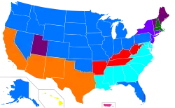 Los estadounidenses blancos son la mayoría en cuarenta y nueve de los cincuenta estados, con Hawái como la excepción. El distrito de Columbia, que no es un estado, también tiene una mayoría no blanca.[12] Los blancos no hispánicos, sin embargo, son la mayoría en cuarenta y seis estados, con Hawái, Nuevo México, California, y Texas, así como el distrito de Columbia, como las excepciones.[13] Estos cinco tienen "mayorías minoritarias", es decir, grupos minoritarios son la población mayoritaria.