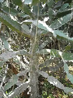 Alcanza entre 3 y 5 m de altura, con tres o cuatro tallos de 5 a 7 cm de diámetro, ramificados en las partes superiores, con nervaduras prominentes en aletas de 1 a 2 cm de ancho y 3 a 5 mm de grosor, triangularmente dentadas. Hojas caducas, alternas, obovoides a oblongas, de 2 a 5 de largo por 1 a 2 cm de ancho, base atenuada, margen entero, ápice redondeado, con espinas protectoras pareadas de 2 a 5 mm de longitud. Los pecíolos son muy cortos y las estípulas como púas. Inflorescencia en ciato subterminal con pedúnculo de 2 a 3 mm con 5 lóbulos, redondeados, denticulados. Semillas subglobosas de aproximadamente 2 mm de diámetro.[3]
