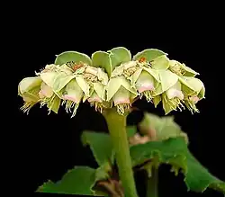 Euphorbia: nombre genérico que deriva del médico griego del rey Juba II de Mauritania (52 a 50 a. C. - 23), Euphorbus, en su honor – o en alusión a su gran vientre – ya que usaba médicamente Euphorbia resinifera. En 1753 Carlos Linneo asignó el nombre a todo el género.[4]
