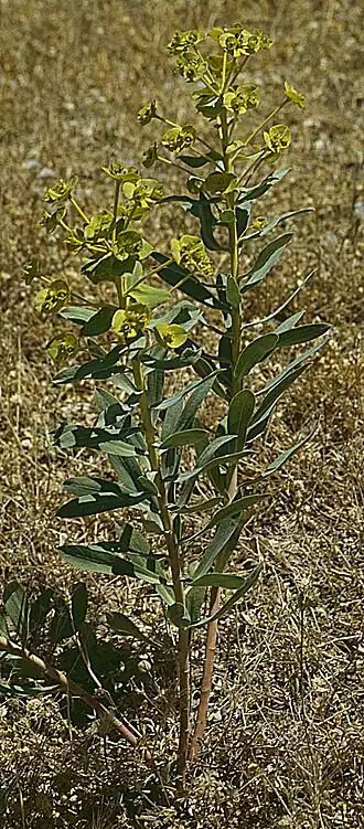 Esta lechetrezna se caracteriza porque las inflorescencias aparecen agrupadas en dos o tres umbelas superpuestas y bien definidas en la parte alta de los tallos. Esta estructura no se repite en ninguna otra Euphorbia. Se trata de una especie perenne con hojas estrechamente lanceoladas. Vive en los claros de los matorrales y campos abandonados. Florece en abril y mayo[1]