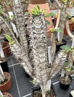 Euphorbia: nombre genérico que deriva del médico griego del rey Juba II de Mauritania (52 a 50 a. C. - 23), Euphorbus, en su honor – o en alusión a su gran vientre – ya que usaba médicamente Euphorbia resinifera. En 1753 Carlos Linneo asignó el nombre a todo el género.[4]