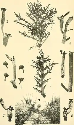 ![]() Fig. 2 - Euphorbia decorsei: Punta de una rama fructífera. A la derecha y a la izquierda, frutos trigonales. | ||