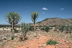 Se encuentra en suelos pedregosos y colinas rocosas, con distribución dispersa en el hábitat del desierto, a 550 m altitud en Angola y Namibia.