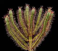 Es una especie columnar suculenta espinosa en forma de candelabro que alcanza los 90 cm de altura. Fuertemente ramificada desde la base es un arbusto dioico, cubierto con espinas largas y rojas. Los tallos son cilíndricos, rectos o curvos, gruesos como un dedo, una anchura de 3 cm y 20-30 cm de largo, la ramificación desde la base, y preferiblemente en el centro, de color gris-verde o azul-verde. Las costillas en número de 6-7 (8), con profundos valles entre ellas, son de color verde grisáceo, cubierto de pequeñas protuberancias. Las hojas son pequeñas. Las inflorescencias masculinas por separado en el pedúnculo, de 8-25 mm de largo, más cortas que la femenina, con 4-6 pequeñas brácteas, de 5 mm de diámetro, de color rojo oscuro.[2]