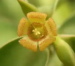 Euphorbia: nombre genérico que deriva del médico griego del rey Juba II de Mauritania (52 a 50 a. C. - 23), Euphorbus, en su honor – o en alusión a su gran vientre – ya que usaba médicamente Euphorbia resinifera. En 1753 Carlos Linneo asignó el nombre a todo el género.[4]