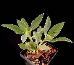Euphorbia: nombre genérico que deriva del médico griego del rey Juba II de Mauritania (52 a 50 a. C. - 23), Euphorbus, en su honor – o en alusión a su gran vientre – ya que usaba médicamente Euphorbia resinifera. En 1753 Carlos Linneo asignó el nombre a todo el género.[5]