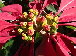Euphorbia pulcherrima, es el nombre científico, Cuetlaxochitl es el nombre náhuatl original, y el nombre común o comercial es Flor de Pascua, en España y, con diversos nombres en el mundo Hispano. Es una especie de la familia Euphorbiaceae nativa de México.[3]y Centroamérica. Se utiliza frecuentemente en jardinería como arbusto, pero principalmente en floricultura como planta de interior en Navidad. Existen más de 100 variedades cultivadas de esta especie.[4][5]