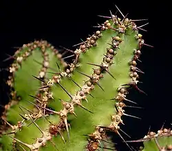 Se trata de una rara planta suculenta con tallo angular y espinoso con las inflorescencias en ciatios. Tiene un tamaño de 0.1 - 0.35 m de altura.[2]