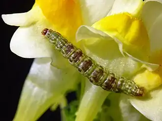 Las orugas adultas son lisas y robustas. Son de color verdoso, amarillento u ocre y muestran una marca dorsal gris-marrón distintiva en cada segmento que consiste en bandas o manchas transversales dentadas.