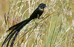 - ↑ a b c d «Red-collared Widowbird». Internet Bird Collection. Consultado el 18 de diciembre de 2012.