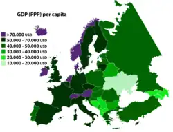 Europa es el segundo continente más pequeño en términos de superficie. Abarca 10 530 751 km² o el 2 % de la superficie del mundo y alrededor de 6,8 % del total de las tierras emergidas. Alberga un gran número de Estados soberanos (alrededor de 50) cuyo número exacto depende de la definición de la frontera de Europa, así como de la exclusión o inclusión de Estados parcialmente reconocidos. De todos los países europeos, Rusia es el mayor en superficie (aun cuando solamente se tiene en cuenta la parte europea de este país euroasiático), al mismo tiempo que es el Estado soberano reconocido internacionalmente más extenso del mundo,[6] mientras que la Ciudad del Vaticano es el más pequeño (al mismo tiempo que es el Estado soberano e internacionalmente reconocido más pequeño del mundo). Europa es el cuarto continente más poblado después de Asia, África y América, con el 10,03 % de la población mundial (2017).[7]