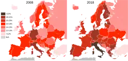 - El ateísmo es minoritario (pero creciente): según la obra de J. Baudérot, Religión y laicidad en la Europa de los 12, 1994, página 259: un cuarto de la población de la UE sería «no religiosa» y el 5 % de los europeos serían ateos. Una encuesta llevada a 21 países sobre 21 000 personas y publicada en diciembre de 2004 anunció que el 25 % de los europeos del este se declaran ateos contra un 12 % en los países de Europa Central y Oriental. En el caso de los países excomunistas de Europa Oriental, el ateísmo se mantiene o se redujo desde la década de 1990 hasta ahora, caso contrario, en Europa Central y principalmente Nórdica el ateísmo se ha elevado en el mismo período. Según algunas encuestas religiosas hechas por el Wall Street Journal, el Eurobarómetro, etc., el ateísmo y agnosticismo se distribuyen de esta manera: 1 % en Turquía, 6 % en Rumanía, 6 % en Irlanda,[cita requerida] 8 % en Grecia, 9 % en Suiza, 10 % en Bulgaria, 11 % en Polonia, 14 % en Escocia, el 14 % en Italia, 17 % en Irlanda,[cita requerida] 20 % en Ucrania, 22 % en Noruega, 23 % en Austria, 24,9 % en España, 26 % en Alemania, 27,8 % en Bélgica, 29 % en Inglaterra, 32 % en Finlandia, 34 % en Francia, 36 % en Rusia, 41 % en los Países Bajos, 44 % en Dinamarca, 46 % en Suecia; y finalmente en Chequia y Estonia representan más de la mitad siendo el 51 % en el primero y el 55 % en el segundo, ambos junto con China (52 %) encabezan entre los países más ateos o menos creyentes del mundo.