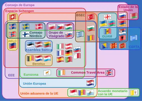 - Eurozona (1999): Creada por los países de la Unión, actualmente 19, que aceptaron el euro como moneda y toman las decisiones a través del Banco Central Europeo. Además otros cuatro países fuera de la Unión utilizan el euro mediante un acuerdo previo (Andorra, San Marino, Mónaco y Vaticano) y dos lo hacen sin acuerdo previo, Kosovo y Montenegro).