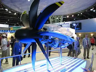El motor dispone de un doble generador de gas, con una tercera turbina de potencia conectada a las bajas presiones (LP) de 5,3 metros de diámetro, ocho palas, hélice de materiales compuestos, con un reductor de revoluciones. La configuración del carburador de gas es la siguiente: Compresor de cinco etapas LP, dirigido por una turbina LP de una etapa; compresor de contra-rotación de Altas Presiones (HP) de seis etapas dirigido por una turbina HP con refrigeración de una única etapa. La turbina de potencia tiene tres etapas.