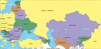 ![]() Mapa con los países evaluados con el programa de evaluaciones de desempeño ambiental de la CEPE-ONU. Los países en marrón participaron en el primer ciclo del programa, los que aparecen en verde en el segundo ciclo y los que figuran en púrpuraen el tercer ciclo | ||