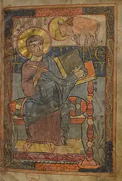 San Juan recibe un estatus especial principalmente debido a que su representación está en la misma apertura que Cristo en majestad (San Juan evangelista en el lado izquierdo y Cristo en majestad a la derecha).[12] Las dos imágenes presentan un contraste notable. Jesús se sienta en un banco con cojines mientras que San Juan en una silla parecida a un trono. El trono está considerado tradicionalmente como una representación de los cuatro evangelistas pero representa otra capa de significado en estas imágenes. El trono es también una representación de Carlomagno. De esta manera, San Juan sentado en un trono frente a la imagen de Jesucristo es una muestra de autoridad imperial sobre la Iglesia.[13] A San Juan se lo representa con un estilo que está mojando en tinta y páginas sobre las que va a escribir. Cristo simplemente sostiene un libro cerrado en su pecho. Se sugiere así que en la vida de Cristo, él añade poco contenido creativo y hace su trabajo de transmitir el mensaje escrito por los evangelistas.[14]