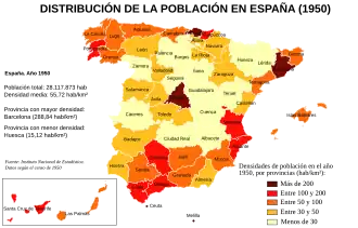 Además, en general (salvo para Andalucía), las zonas de emigración eran las zonas menos densamente pobladas, con lo que las diferencias en la distribución de la población se exacerbaron aún más entre el interior, despoblado (calificado gráficamente como el "desierto central" por Jordi Nadal), y las zonas costeras y Madrid, con densidades de población extremadamente más elevadas. En 1950, Barcelona (la provincia más densamente poblada) tenía 289 hab./km², 19 veces más que Huesca (la provincia menos densamente poblada). En 1981, Barcelona había alcanzado los 598 hab./km 2, lo que era 62 veces más que Soria (la provincia menos densamente poblada desde los años sesenta).