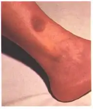 Consiste en la aparición de una o varias lesiones en la piel que son de aspecto redondeado u ovalado y tienen un color rojizo o violáceo. En el centro de la lesión puede aparecer una vesícula que tiende a erosionarse y formar una costra, cuando la lesión se cura puede dejar como secuela una zona en la piel de tono más oscuro (hiperpigmentación), fenómeno que persiste durante semanas o meses.[5]