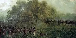 La escaramuza se convirtió en una batalla a gran escala hacia las 4:00 p. m.[85][86] Después de que los estadounidenses expulsaron a los lenapes del Capitán Pipe del bosque y los empujaron hacia la pradera, los lenapes fueron reforzados por los wyandots de Dunquat.[87][f] El agente del Departamento Indio Británico, Matthew Elliott, podría haber estado presente coordinando las acciones de lenapes y wyandots.[75] [g] Los lenapes de Pipe flanquearon hábilmente la posición estadounidense y luego atacaron por la retaguardia. Algunos nativos se acercaron sigilosamente a las líneas estadounidenses en la alta hierba de la pradera. Los estadounidenses respondieron trepando a los árboles para tener mejores oportunidades de disparo. El humo de los fusiles llenaba el aire, dificultando la visibilidad. Tras tres horas y media de disparos incesantes, los nativos gradualmente abandonaron el ataque con la llegada del anochecer.[91][92][93] Ambos bandos durmieron con las armas listas y rodearon sus posiciones con grandes fogatas para prevenir ataques sorpresa durante la noche.[88]