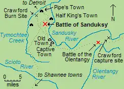 - ↑ Varias breves cuentas de la expedición indican que fue Crawford quien "se detuvo" con sus hombres en la Batalla del Olentangy y que su captura tuvo lugar después de este enfrentamiento.>[114]