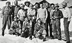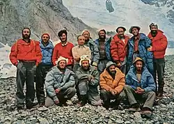 - ↑ Los miembros del equipo fueron, desde la izquierda de pie: Ubaldo Rey, Ugo Angelino, Walter Bonatti, Ardito Desio (jefe, brazos cruzados), Lino Lacedelli, Erich Abram, Gino Soldà, Achille Compagnoni, Cirillo Floreanini. Desde la izquierda sentados: Sergio Viotto, Mario Fantin (cámara), Guido Pagani (doctor), Pino Gallotti.