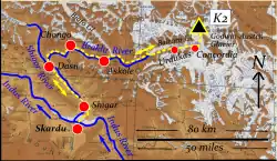 - ↑ Mahdi (también transliterado Mehdi} procedía de Hassanabad.[31] Los hunza realizaban el trabajo equivalente al de los sherpas nepalíes.