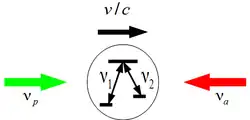 con como frecuencia del rayo láser que se propaga en sentido contrario al haz de iones y como frecuencia del rayo láser que se propaga en paralelo al haz de iones. y son las frecuencias de transición de las transiciones en reposo. , con como velocidad del ion y como la velocidad de la luz. En el caso de la espectroscopia de saturación, la fórmula cambia a: