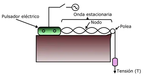 Las ondas transversales mecánicas producidas en una cuerda impulsadas por un vibrador eléctrico, viajan a una polea que conduce al otro extremo del mismo, donde es producida una determinada tensión mecánica sobre el cable. Al encontrarse ambas ondas viajando en direcciones opuestas se produce un fenómeno de interferencia de ondas. Al tensarse apropiadamente la cuerda, manteniendo la distancia entre el pulsador eléctrico y la polea, se producen ondas estacionarias, en las cuales existen puntos de su trayectoria denominados nodos que permanecen inmóviles.