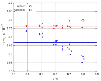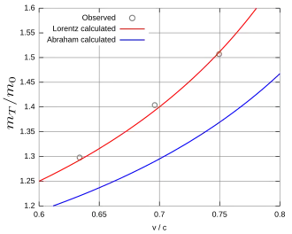 Estos trabajos experimentales estaban relacionados con la predicción teórica de la masa electromagnética realizada en 1881 por J. J. Thomson, quien demostró que la energía electromagnética contribuye a la masa de un cuerpo cargado en movimiento.[2] El propio Thomson (1893) y George Frederick Charles Searle (1897) también calcularon que esta masa depende de la velocidad, y que se vuelve infinitamente grande cuando el cuerpo se mueve a la velocidad de la luz con respecto al éter.[3] También Hendrik Antoon Lorentz (1899, 1900) asumió tal dependencia de la velocidad como consecuencia de su teoría de los electrones.[4] En ese momento, la masa electromagnética se separaba en masa "transversal" y "longitudinal", y a veces se denotaba como "masa aparente", mientras que la masa newtoniana invariante se denotaba como "masa real".[A 1][A 2] Por otra parte, el teórico alemán Max Abraham creía que toda masa acabaría demostrando ser de origen electromagnético y que la mecánica newtoniana quedaría subsumida en las leyes de la electrodinámica.[A 3]