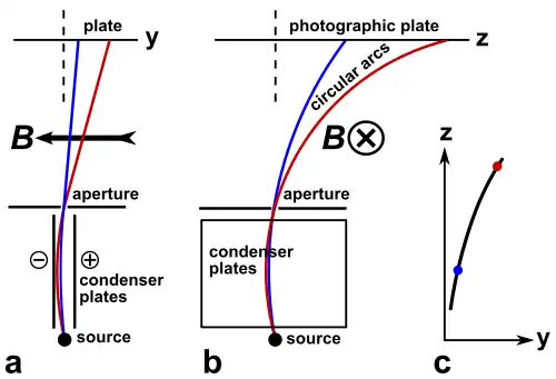 Walter Kaufmann comenzó a experimentar con partícula beta usando un dispositivo similar a un tubo de rayos catódicos, donde la fuente de los electrones era la desintegración de una fuente del elemento radio que se colocaba en una cámara sometida al vacío (véase la figura 1). Estos rayos emitidos por el radio se llamaban en ese momento "rayos Becquerel". A diferencia de los entonces conocidos como rayos catódicos, que alcanzaban velocidades de solo 0,3c, siendo c la velocidad de la luz, los rayos de Becquerel alcanzaban velocidades de hasta 0,9c. Sin embargo, como las partículas beta tienen diferentes velocidades, la radiación no era homogénea. Por lo tanto, Kaufmann aplicó campos eléctricos y magnéticos alineados y paralelos entre sí, de modo que las deflexiones causadas fueran perpendiculares entre sí. Sus impactos sobre una placa fotográfica produjeron una curva de desviación, cuyos puntos individuales correspondían a una determinada velocidad y a una determinada masa de los electrones. Invirtiendo la carga en el condensador, invirtiendo así el campo eléctrico, se podían obtener dos curvas simétricas, cuya línea central determinaba la dirección de la desviación magnética.[A 4][A 5]
