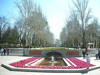 El pabellón principal estaba separado por una avenida, flanqueada de grandes ranas cerámicas, que conducía a un lago alimentado de una ría. El lago desembocaba en una rocalla con una cascada de cierta altura, y sobre ella se edificó el Pabellón Real. Un segundo lago de menor tamaño conducía el agua a través de otra ría de nuevo al lago grande, cerrando el circuito.