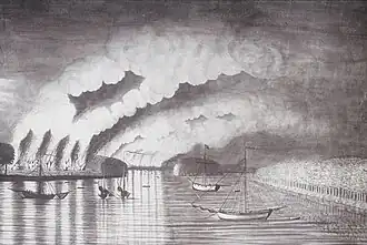 Campaña del río Saint John: «Una vista del saqueo y quema de la ciudad de Grimross» (1758) Pintura de Thomas Davies | ||||