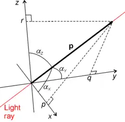 En el contexto de la óptica hamiltoniana, en un punto del espacio, un rayo de luz puede estar completamente definido por un punto r = (x, y, z), un vector unidad v = (cos αX, cos αY, cos αZ) que indica su dirección y el índice de refracción n en el punto r. El momento óptico del rayo en ese punto está definido por