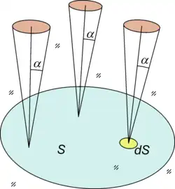Teniendo en cuenta que dΩ se expresa en coordenadas esféricas, si una superficie grande S es atravesada por (o emite) luz también confinada a un cono de ángulo α, la extensión del haz de luz S es