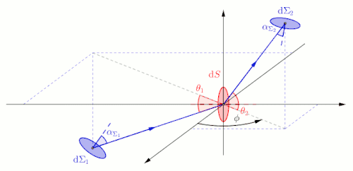 donde dΩΣ es el ángulo sólido definido por el área dS en el área dΣ. Del mismo modo, la extensión del haz de luz dS que proviene de dΣ viene dada por: