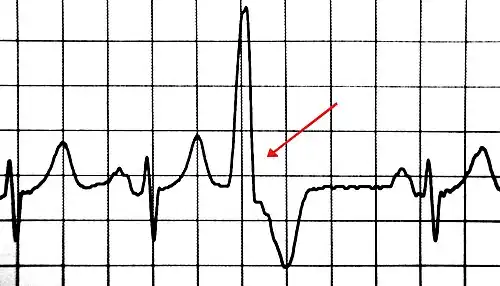 Una contracción ventricular prematura, marcada con una flecha. | ||