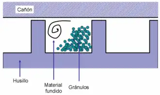 - 2. Zona de compresión: En esta zona, los gránulos de polímero son comprimidos y están sujetos a fricción y esfuerzos cortantes, se logra una fusión efectiva