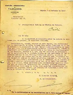 En 1919, la Dirección de la Compañía Arrendataria de Tabacos remite una carta al Director de la Fábrica de Tabacos de Cádiz, comunicándole que se ha implantado la jornada de 8 horas.[1]