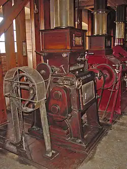 El primer molino doble, Daverio Super Novo, en la primera planta, hace la primera y segunda trituración. Continúa la molturación en los siguientes molinos de la primera planta: Daverio Novo diagonal, para tercera y cuarta trituración; Daverio diagonal, desagregador y primera compresión; Robinson, para segunda y tercera compresión; Daverio, para cuarta y quinta compresión; Daverio, para sexta compresión y quinta trituración.