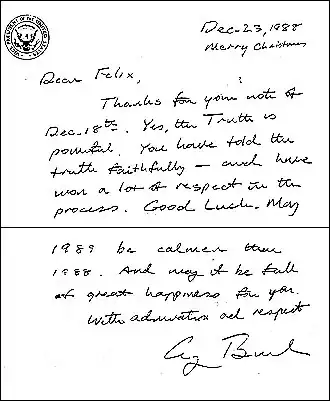 Estimado Félix: Gracias por tu nota del 18 de diciembre. Sí, la Verdad es poderosa. Tú has dicho la verdad con convicción y obtenido mucho respeto en el proceso. Buena suerte. Que 1989 sea más calmado que 1988. Y que esté pleno de mucha felicidad para ti. Con admiración y respeto,