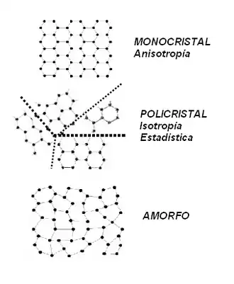 - Policristal: está compuesto por diversas regiones en las que individualmente se recrea un monocristal aunque las disposiciones de cada una de estas regiones no son simétricas entre sí. Presenta lo que se llama Isotropía estadística.
