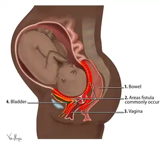 La fístula obstétrica es una afección por la cual se desarrolla un agujero en el canal de parto a raíz de este.[1][3] Puede localizarse entre la vagina y el recto, el uréter o la vejiga.[1][4] Como resultado, la madre puede presentar incontinencia de orina o de heces, lo cual suele acarrear depresión, infertilidad y aislamiento social.[1]