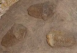 - Paleozoico: trilobites (y sus pistas, las crucianas), bivalvos, crinoides, foraminíferos, plantas.