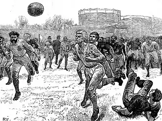 Los colegios británicos se dividieron frente al Código Rugby; mientras varios decidieron seguirlo, otros decidieron rechazarlo debido a que en ellos la práctica era no tocar el balón con la mano. Entre estos últimos colegios se encontraban los de Eton, Harrow, Winchester, Charterhouse y Westminster.[22] A mediados del siglo XIX se dieron los primeros pasos para unificar todos los códigos del fútbol en uno. El primer intento fue en 1848, cuando en la Universidad de Cambridge, Henry de Winton y John Charles Thring hicieron un llamamiento a miembros de otras escuelas para reglamentar un nuevo código, el Código Cambridge, también conocido como las Reglas de Cambridge.[24] Las reglas presentaban un importante parecido a las reglas del fútbol actual. Quizás el más importante de todos fue la limitación de las manos para tocar la pelota, pasando la responsabilidad de trasladar la misma a los pies. El objetivo del juego era hacer pasar una pelota entre dos postes verticales y por debajo de una cinta que los unía, y el equipo que marcaba más goles era el ganador. Incluso se creó una regla de fuera de juego similar a la actual.[25] Los documentos originales de 1848 se perdieron, pero se conserva una copia de las reglas de 1856.[26] Entre 1857 y 1878 se utilizó un código del fútbol que también aportaría características al fútbol moderno: el Código Sheffield, también conocido como las Reglas de Sheffield. El código, creado por Nathaniel Creswick y William Prest, adoptó reglas que se ven reflejadas en el fútbol actual, como el uso de un travesaño (poste horizontal) de material rígido, en lugar de la cinta que se usaba hasta el momento. También se adoptó la utilización de tiros libres, saques de esquina y saques de banda como métodos de reanudación del juego.[27]