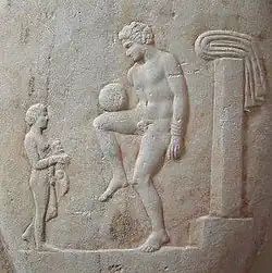 La humanidad ha realizado a lo largo de su historia diversos juegos de pelota, desde la Antigüedad. Se conoce que este entretenimiento existía tanto en la cultura del Mar Mediterráneo como en América.[15] El hallazgo más antiguo y revelador se remonta a un relieve de la Antigua Grecia (400 a. C.), donde un hombre domina una pelota sobre su muslo. Este deporte era el episkyros,[16][17] que se jugaba con una pelota de cuero pintada con colores brillantes y dos equipos de 12 a 14 jugadores. La FIFA lo reconoció como una de las formas más antiguas del actual balompié.[18] Más tarde, en Roma, el mismo recibió el nombre de harpastum.[19]